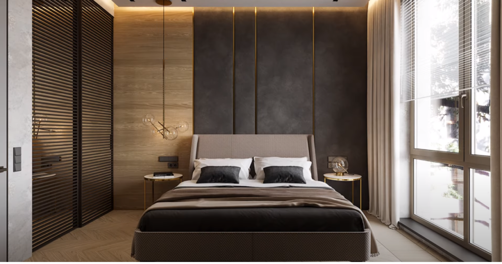 If your man’s bedroom has a modern design, then you should consider adding geometric patterns to it. These can be done in various ways, such as through wallpaper or furniture pieces. Geometric shapes create a unique and interesting look that really stands out. It will also add dimension and depth to the room, making it feel more spacious and open. Just make sure that the colors you choose for these patterns are dark and muted – anything too bright or loud could clash with the overall vibe of the space.